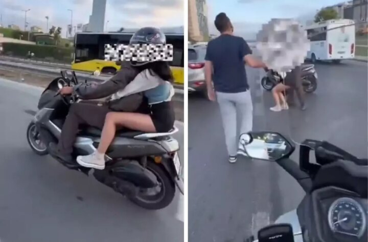 İstanbul'da motosikletli çift, trafikte tehlikeli hareketler yapınca öteki bir motosiklet şoförü tarafından "Dikkatli olun"...