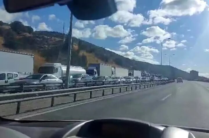 Kocaeli TEM Otoyolu'nda mıcır yüklü bir tırın devrilmesi sonucu İstanbul istikametindeki trafik durma noktasına...